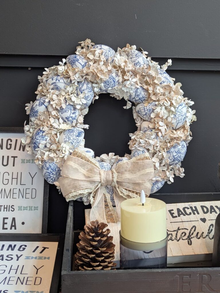 In this past workshop, participants created handmade Easter wreaths using decoupage to decorate eggs and arranging them with hydrangea flowers into a balanced design.